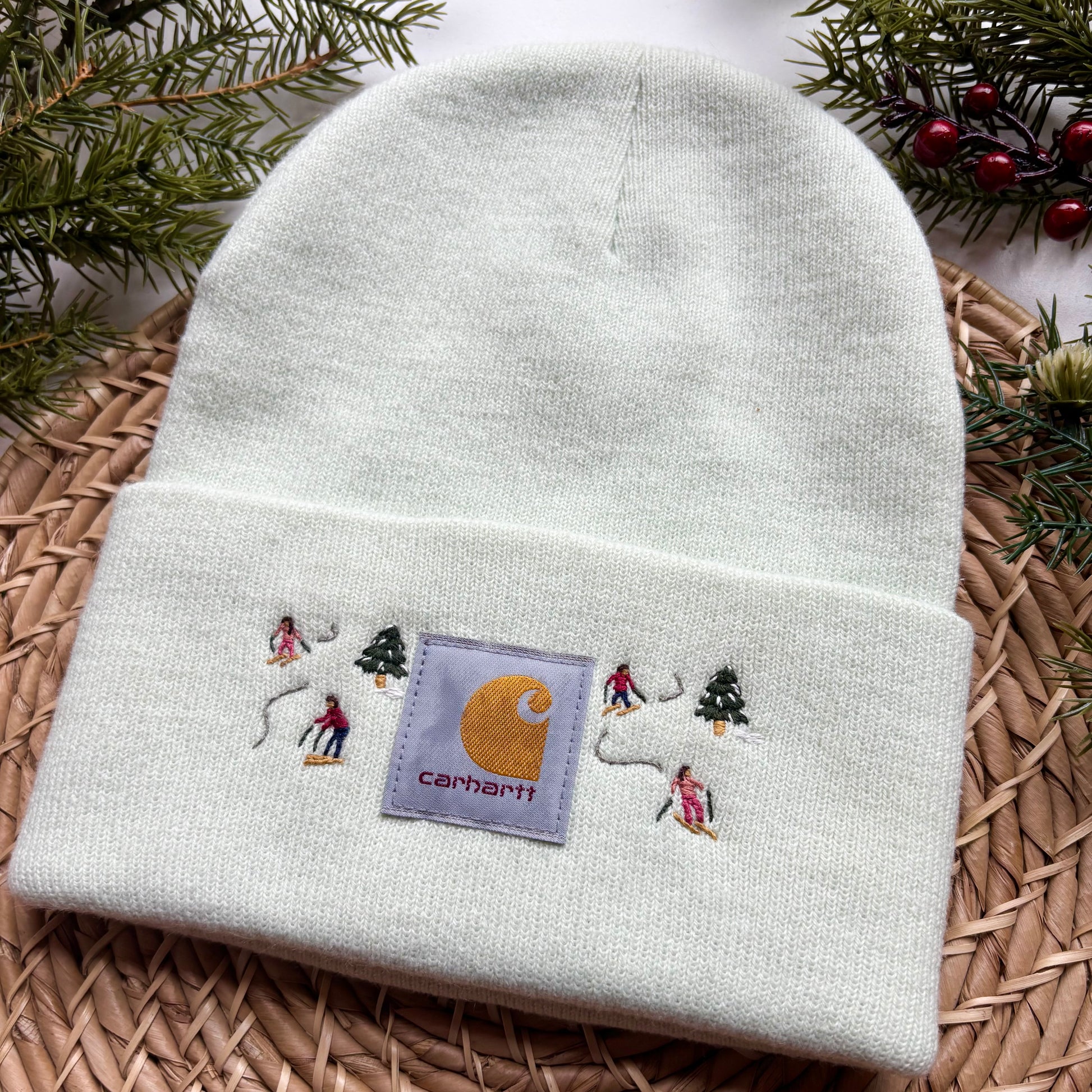 Adult sized hand-embroidered skier Carhartt beanie in pale green