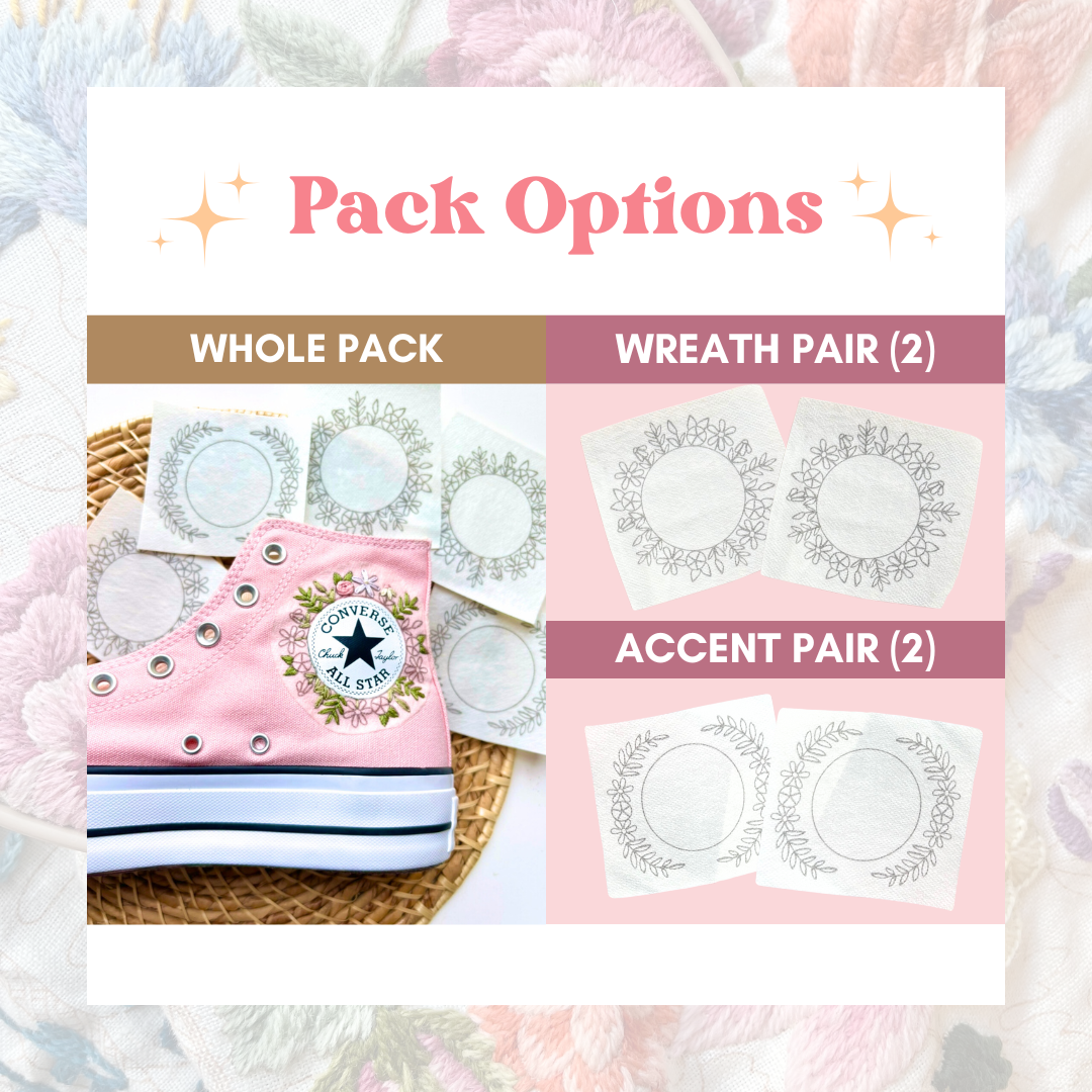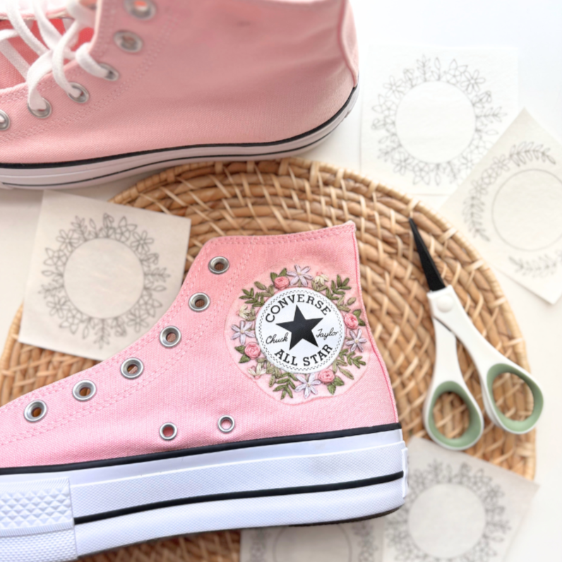 These converse shoe stick & stitch embroidery patterns are pre-transferred and ready to place around the logo of adult Chuck Taylor high top All Star sneakers! Simply peel the pattern off, stick on the shoe, stitch, wash, and wear!