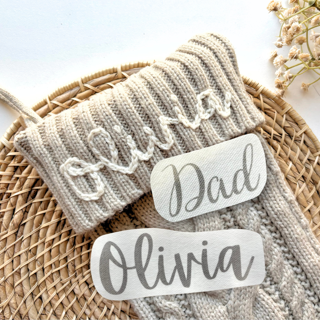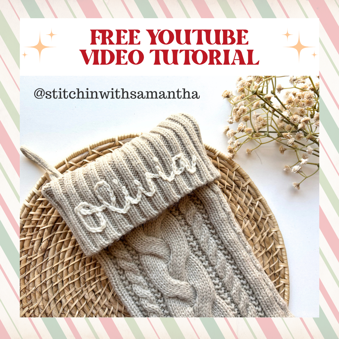 Create DIY Embroidered Christmas Stockings for the whole family!! This personalized beginner stick and stitch name embroidery pattern is pre-transferred and ready to stitch onto Christmas stockings.