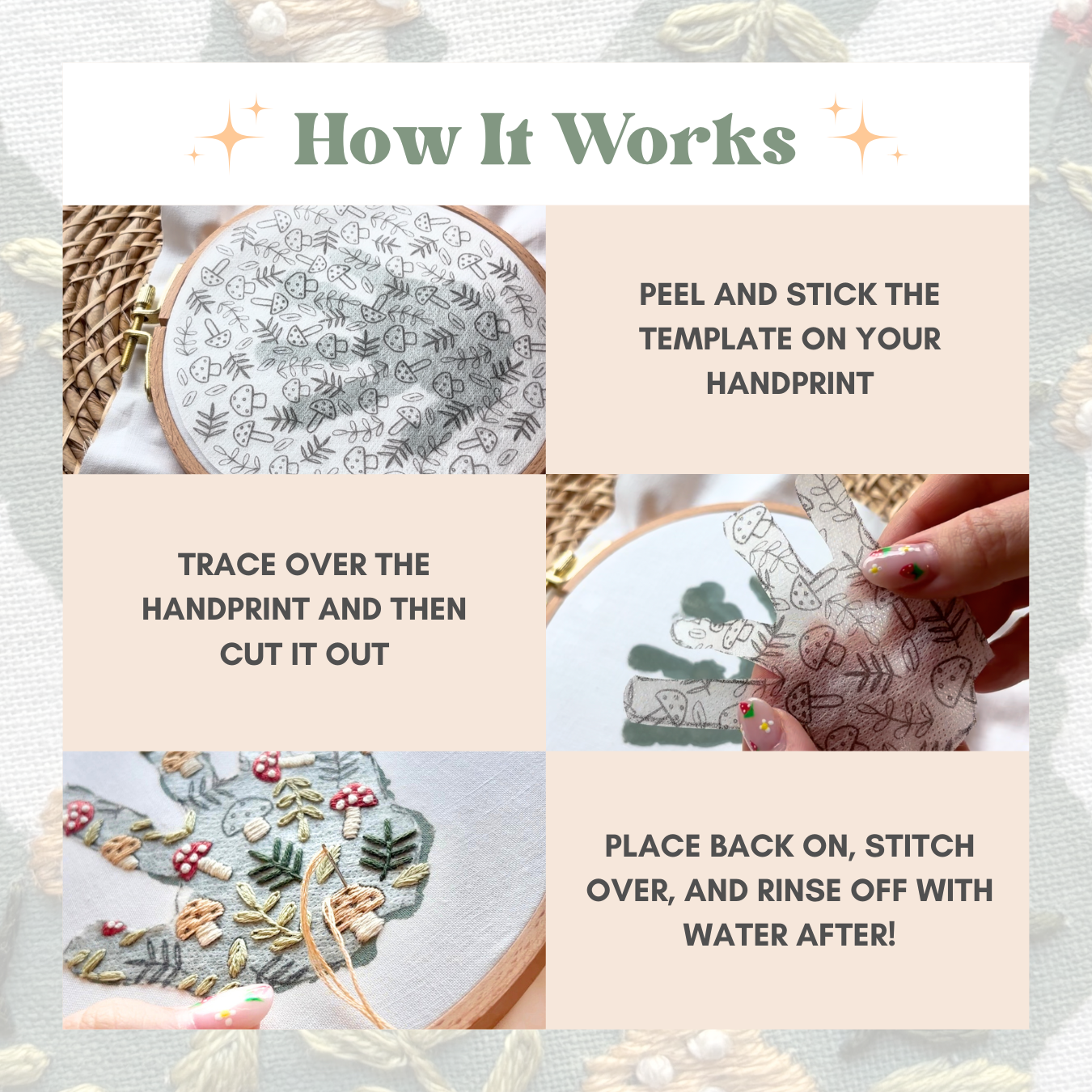 Create an embroidered handprint keepsake for mom, dad, auntie or grandma! These mushroom hoop stick & stitch embroidery patterns are pre-transferred and ready to place onto embroidery hoops to embroidery as is, or trace over items to add flowers!
